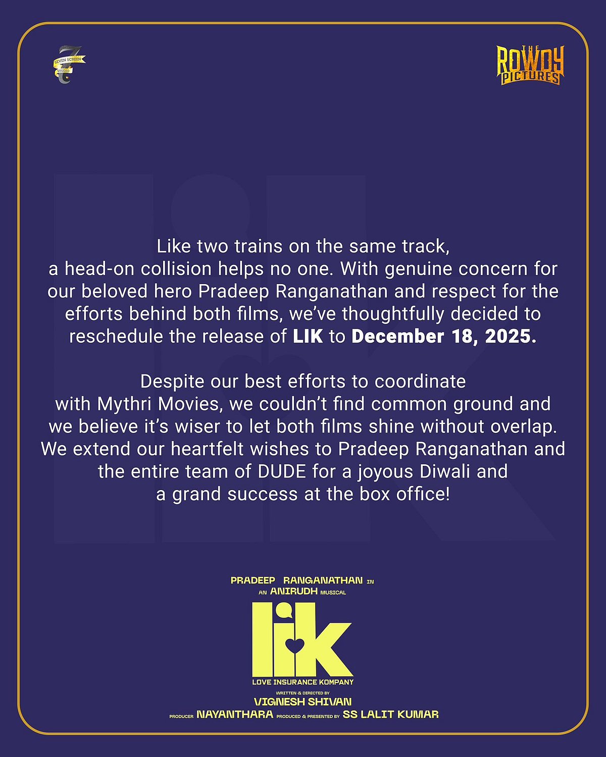 இயக்குநர் விக்னேஷ் சிவன் இயக்கத்தில் நடிகர்கள் பிரதீப் ரங்கநாதன், க்ருத்தி ஷெட்டி நடிப்பில் உருவான எல்ஐகே திரைப்படம் அக்டோபர் 17 ஆம் தேதி வெளியாக இருந்தது.