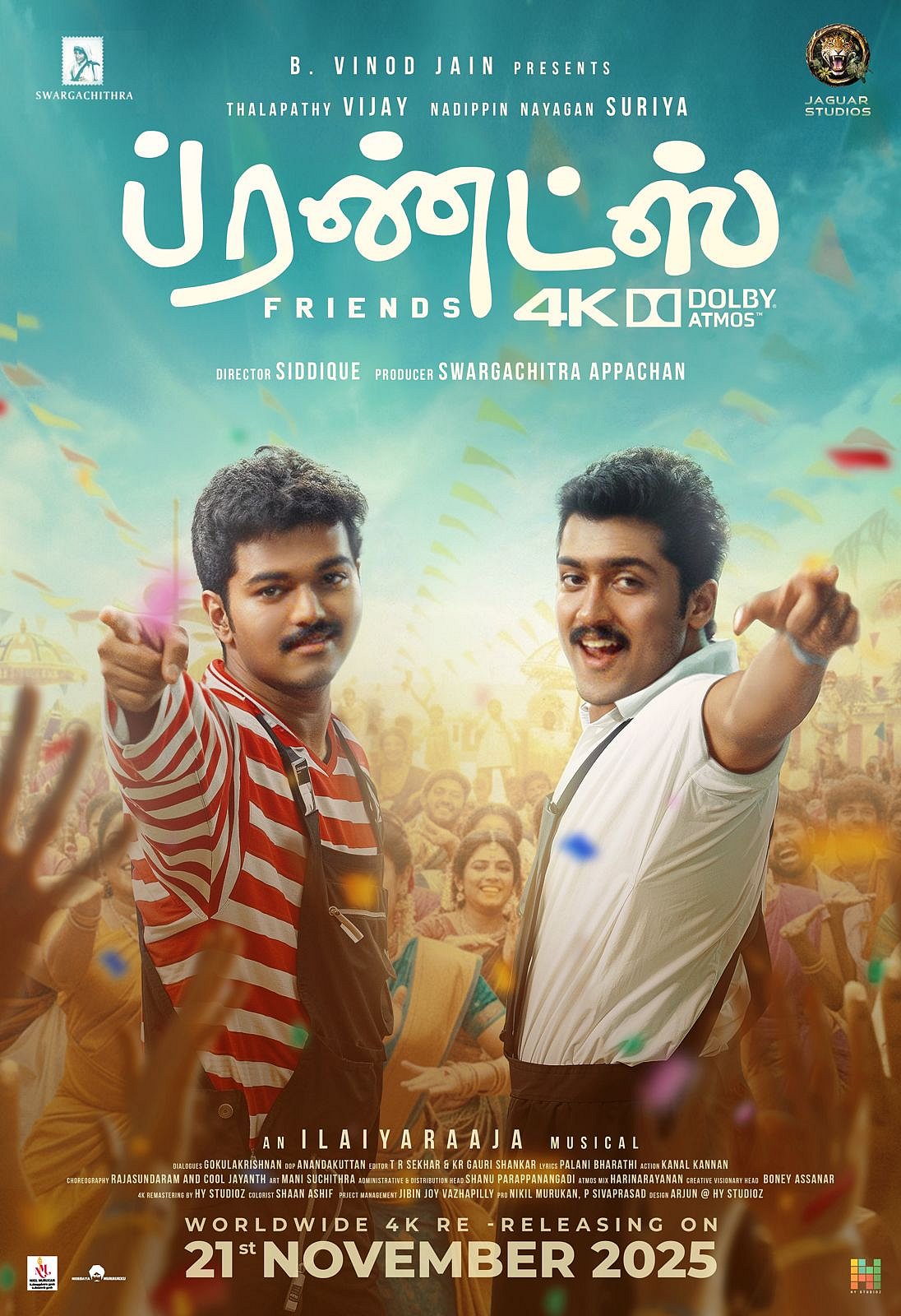 நடிகர்கள் விஜய், சூர்யா நடிப்பில் வெளியான ப்ரண்ட்ஸ் திரைப்படம் மறுவெளியீடாகிறது.