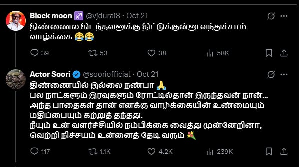 இதற்கு சூரி, ”திண்ணையில் இல்லை நண்பா பல நாள்கள், இரவுகள் ரோட்டில் இருந்தவன் நான்… அந்த பாதைகள்தான் எனக்கு வாழ்க்கையின் உண்மையும் மதிப்பையும் கற்றுத் தந்தது. நீயும் உன் வளர்ச்சியில் நம்பிக்கை வைத்து முன்னேறினா, வெற்றி நிச்சயம் உன்னைத் தேடி வரும்” எனப் பதிலளித்தார்.