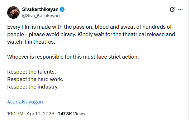 இந்த நிலையில், ஜன நாயகன் திரைப்படம் கசிந்தது தொடர்பாக நடிகர் சிவகார்த்திகேயன் எக்ஸ் தளத்தில் பதிவிட்டுள்ளார்.