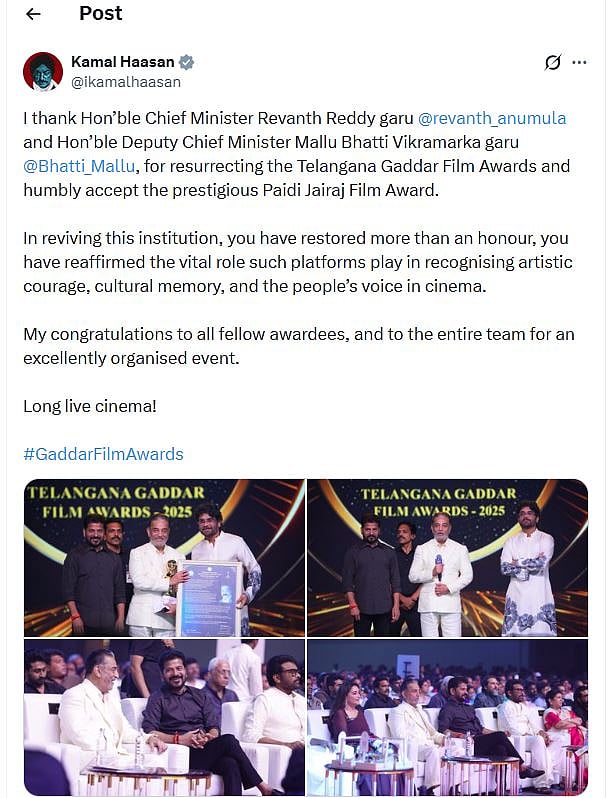 இந்த விருதினைப் பெற்ற கமல் தனது எக்ஸ் பக்கத்தில் இந்த விருது அளித்த தெலங்கானா முதல்வர் ரேவந்த் ரெட்டி, கத்தார் திரைப்பட விழாவை புதுப்பித்த துணை முதல்வர் மல்லு பாட்டி விக்ரமர்காவுக்கும் நன்றி தெரிவித்து, ”சினிமா வாழ்க” எனக் குறிப்பிட்டுள்ளார்.