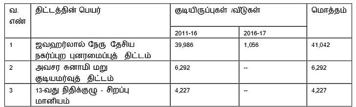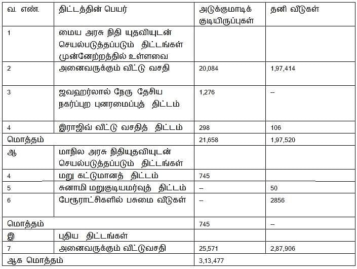 இத்திட்டத்தின் ஒரு பகுதியாக 41,042 குடியிருப்புகள் கட்டப்பட்டுள்ளன. சென்னை மற்றும் கோயம்புத்தூரில் முன்னேற்றத்திலுள்ள மீதமுள்ள 1,276 குடியிருப்புகள் 2017-2018-ஆம் ஆண்டில் முடிக்கப்படும். மீதமுள்ள குடியிருப்புகள் மற்றும் உள்கட்டமைப்பு பணிகள் 2017-2018-ஆம் ஆண்டில் சென்னை மற்றும் கோயம்புத்தூரில் ரூ.143.66 கோடி செலவில் மேற்கொள்ளப்படும். அதன் விவரங்களாவன: