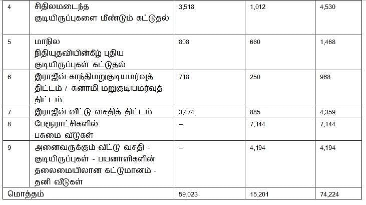 மேலும், இதர நிதி ஆதாரங்களைக் கொண்டு சிதிலமடைந்த குடியிருப்புகளை மறுகட்டுமானம் செய்ய மேற்கொள்ளப்பட்ட பணிகள் முன்னேற்றத்திலுள்ளன.