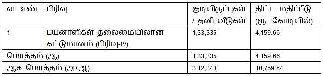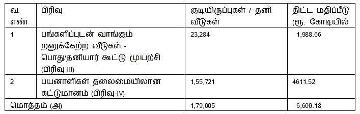 நாட்டிலேயே மிகவும் அதிக அளவிலான ஒப்புதலாகும். இவற்றுள், பேரூராட்சிகளில் ரூ.4,159.66 கோடி செலவில் 1,33,335 தனி வீடுகளும், மாநகரங்கள் மற்றும் நகரங்களில் ரூ.6,600.18 கோடி மதிப்பீட்டில் 1,79,005 வீடுகளும் செயல்படுத்தப்படும். இதன் விவரங்கள் பின்வருமாறு: