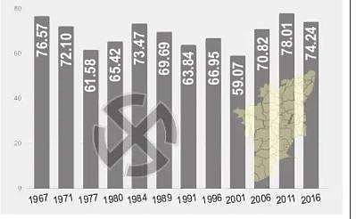 தமிழ்நாடு என பெயா் மாற்றப்பட்ட 1967-ஆம் ஆண்டு காலத்தில் இருந்து இதுவரையில் நடந்த சட்டப் பேரவை பொதுத் தோ்தலுக்கான வாக்கு சதவீதம் 80-ஐ நெருங்கவில்லை. அதன் விவரம்:- (வாக்குப் பதிவு சதவீதத்தில்)