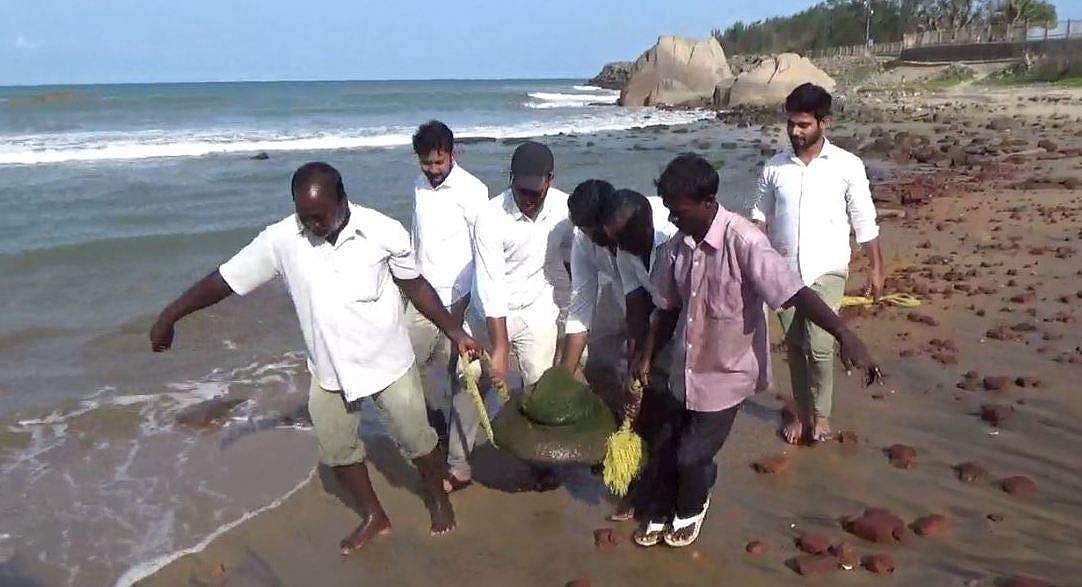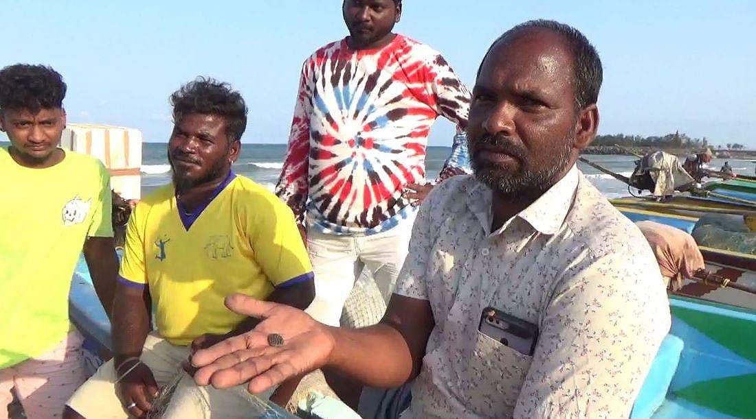 மேலும் கோயில் கட்டுமான பொருட்கள் வெளிவந்த இடத்தில் பழங்கால செப்பு நாணயம் ஒன்றும் மீனவர் கையில் சிக்கியது.