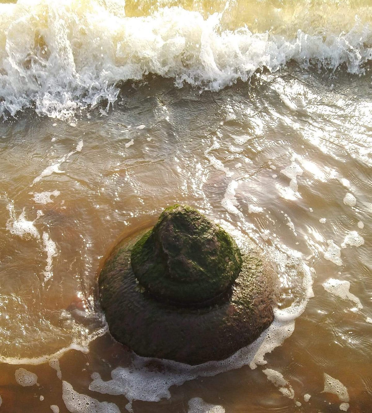 மாமல்லபுரம் கடற்கரை கோயிலுக்கு அருகில் கடலில் புதைந்து வெளிவந்துள்ள தூண்கள், செங்கற்கள், ஸ்தூபிகள் ஆகியவை