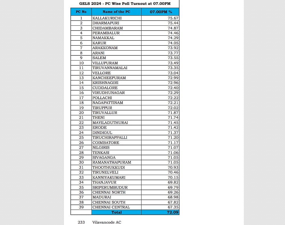இதுகுறித்து அவர் செய்தியாளர்களுக்கு அளித்த பேட்டியில், தமிழ்நாட்டில் இரவு 7 மணி நிலவரப்படி 72.09 சதவீத வாக்குகள் பதிவாகியுள்ளன. அதிகபட்சமாக கள்ளக்குறிச்சியில் 75.67%, தருமபுரியில் 75.44%, மத்திய சென்னை 67.37%, தென் சென்னை 67.82% வட சென்னையில் 69.26% வாக்குகள் பதிவாகியுள்ளன.