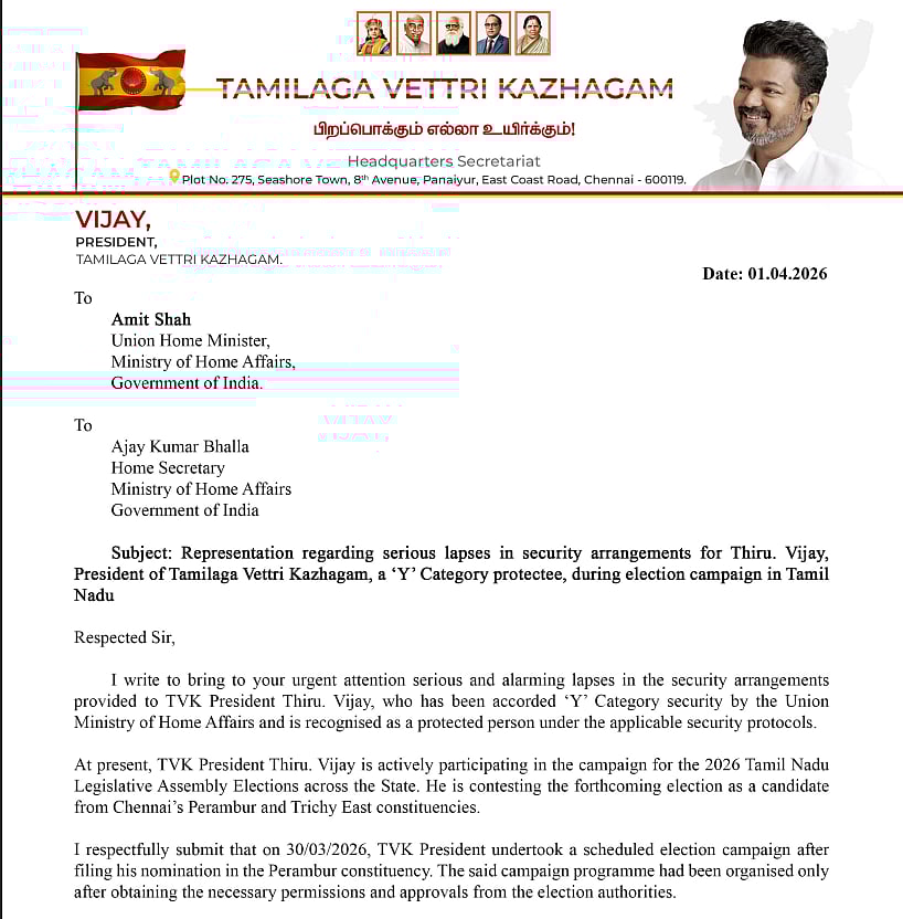 இந்த நிலையில், ஒய் பிரிவு பாதுகாப்பில் உள்ள தவெக தலைவர் விஜய்க்கு பாதுகாப்பு குறைபாடு இருப்பதாகக் கூறி, தவெக இணைப் பொதுச் செயலர் நிர்மல் குமார், மத்திய உள்துறை அமைச்சர் அமித் ஷாவுக்கு கடிதம் எழுதியுள்ளார்.
