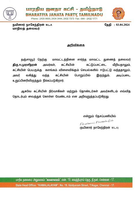 தஞ்சாவூர் தெற்கு மாவட்டத்தின் துணைத் தலைவர் ஆர். முரளீதரனை கட்சியின் அடிப்படை உறுப்பினர் பதவியிலிருந்து நீக்குவதாக மாநிலத் தலைவர் நயினார் நாகேந்திரன் வெள்ளிக்கிழமை தெரிவித்துள்ளார்.