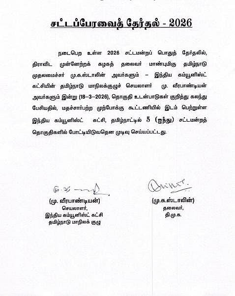 The seat-sharing agreement was signed in the presence of DMK leader and Chief Minister Stalin, Communist Party of India General Secretary M. Veerapandian, and former State Secretary I. Mutharasan.