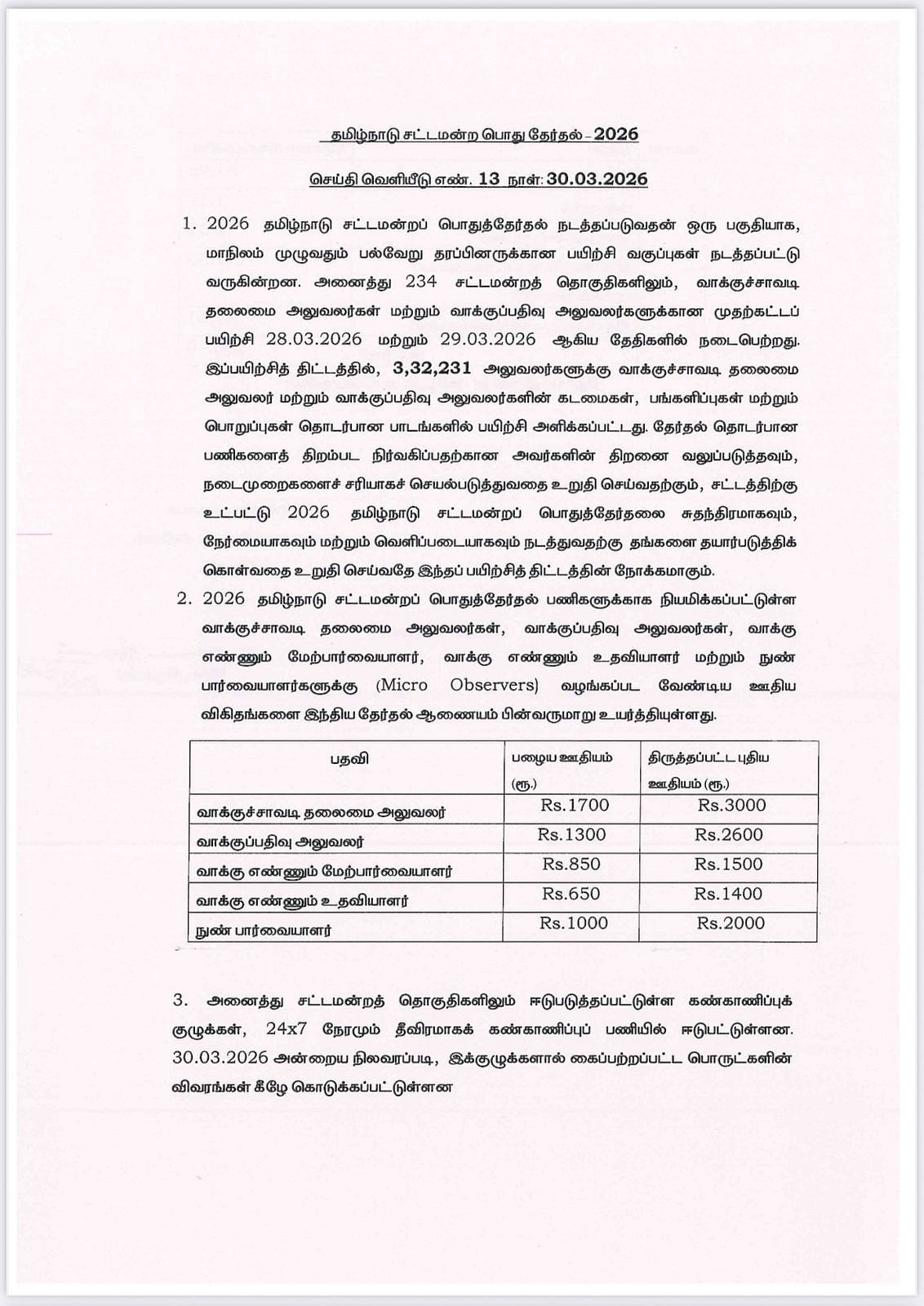 மேலும், வாக்கு எண்ணும் உதவியாளருக்கு ரூ. 650-ல் இருந்து ரூ. 1,400 ஆகவும், நுண் பார்வையாளருக்கு ரூ. 1,000-ல் இருந்து ரூ. 2,000 ஆகவும் உயர்த்தப்பட்டுள்ளது.