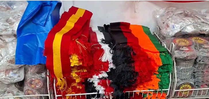 இங்குள்ள கடைகளில் திமுக, அதிமுக, பாஜக, காங்கிரஸ், விசிக, கம்யூனிஸ்ட்கள், மதிமுக, நாம் தமிழர், தவெக, அமமுக, தேமுதிக உள்ளிட்ட அனைத்துக் கட்சிகளுக்கான கொடிகள், வரவேற்பு அட்டைகள், தலைவர்களின் உருவங்களை கொண்ட பிளாஸ்டிக் முகமூடிகள், பேட்ஜ்கள், துண்டுகள் என அனைத்தையும் தயார் செய்து விற்பனைக்காக வைத்துள்ளனர்.