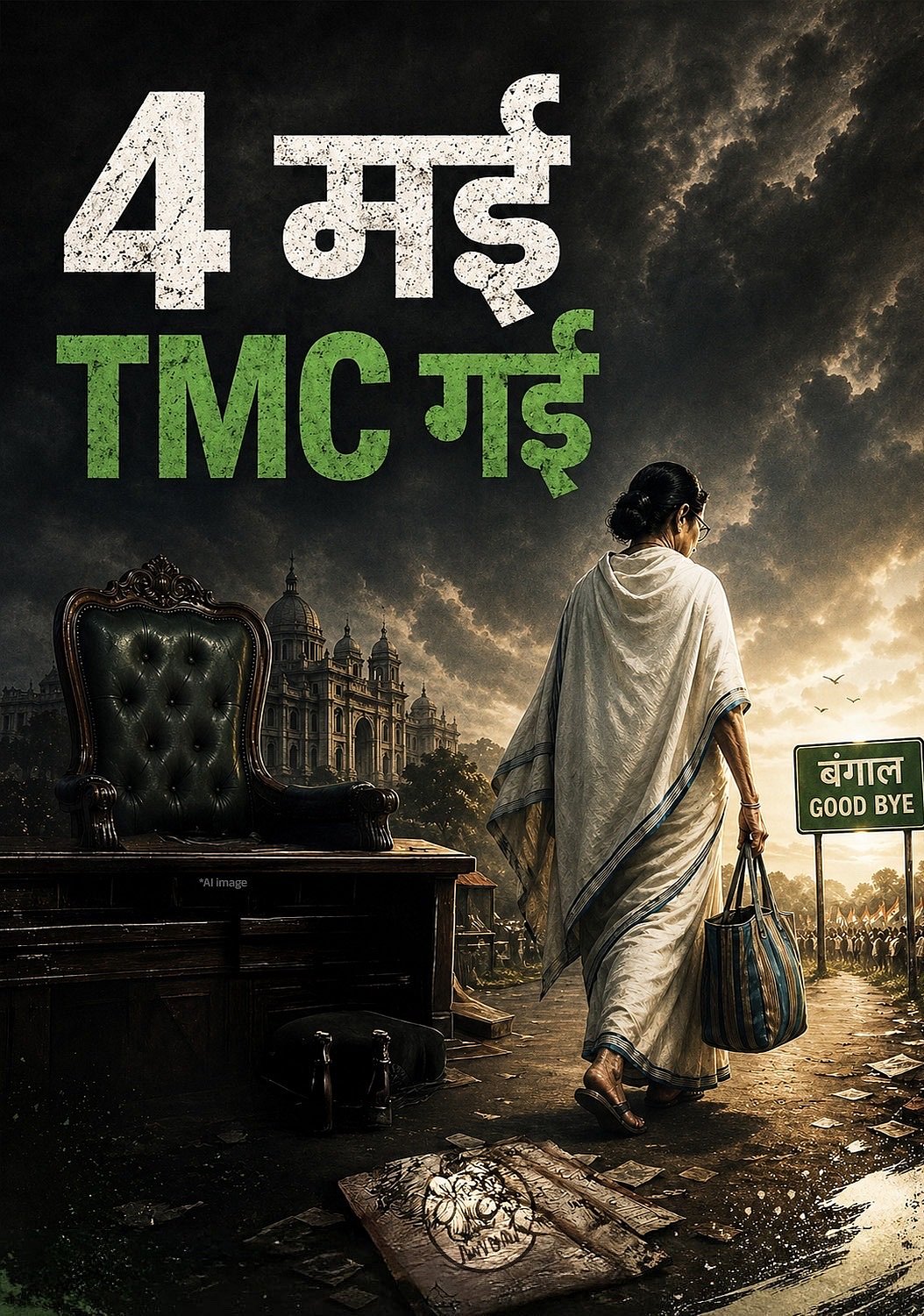 இந்த நிலையில், தில்லி பாஜக எக்ஸ் பக்கத்தில், முதல்வர் பதவியிலிருந்து மே 4 ஆம் தேதி மமதா பானர்ஜி வெளியேறுவது போன்ற சித்திரத்தை பகிர்ந்துள்ளனர். அதிலுள்ள பெயர் பலகையில் “வங்கமே விடைபெறுகிறேன்” (Bengal Good Bye) எனக் குறிப்பிடப்பட்டுள்ளது.