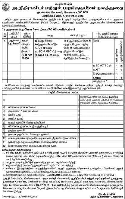 தமிழக அரசு தலைமைச் செயலகத்தில் ஆதிதிரவிடர் மற்றும் பழங்குடியினர் நலத்துறையில் காலியாக உள்ள 5 அலுவலக உதவியாளர்கள் பணியிடங்களுக்கான அறிவிப்பு வெளியிடப்பட்டுள்ளது. இதற்கு 8-ஆம் வகுப்பு முடித்தவர்களிடமிருந்து ஜூலை 2க்குள் அஞ்சல் மூலம் விண்ணப்பங்கள் வரவேற்கப்படுகின்றன.