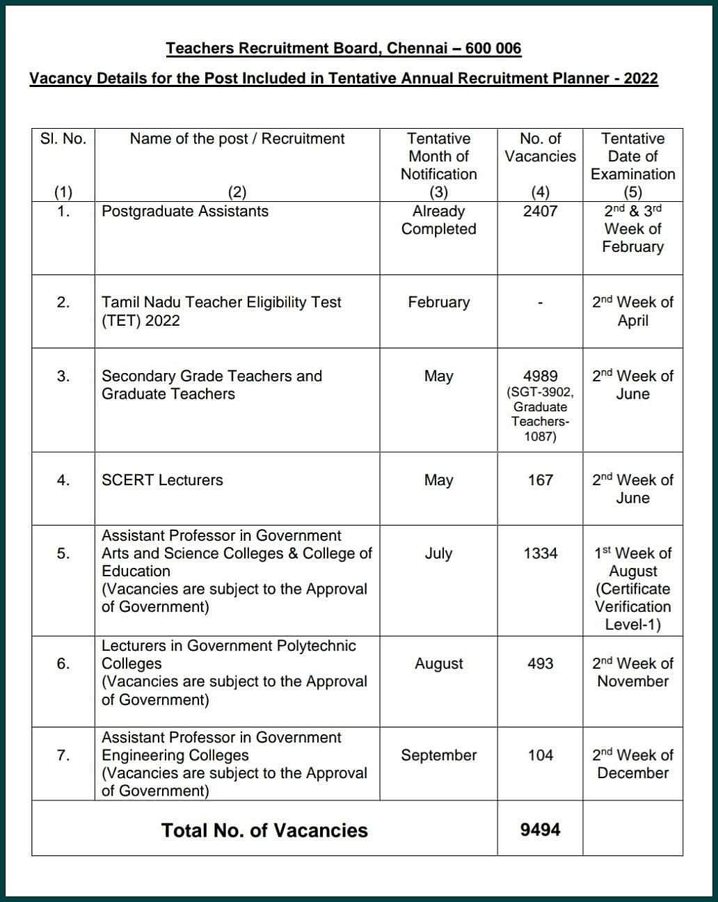 பள்ளிக்கல்வித்துறை, உயா் கல்வித்துறை ஆகியவற்றில் நிகழாண்டில் 9,494 பணியிடங்களை நிரப்புவதற்கான தோ்வு கால அட்டவணையை ஆசிரியா் தோ்வு வாரியம் வெளியிட்டுள்ளது.