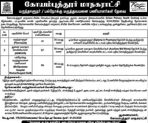 கோயம்புத்தூர் மாநகராட்சியில் செயல்பட்டு வரும் நகர்ப்புற ஆர்ம்ப சுகாதார நிலையங்களில் காலியாக உள்ள மருந்தாளுநர், துணை சுகாதார செவிலியர்கள், பல்நோக்கு மருத்துவமனை பணியாளர் பணி