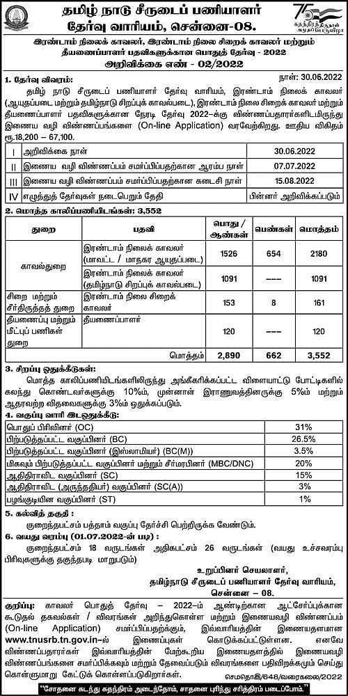 தமிழ்நாடு காவல்துறையில் இரண்டாம் நிலை காவலர், இரண்டாம் நிலை சிறை காவலர், தீயணைப்பாளர் போன்ற 2,890 பணியிடங்களுக்கான வேலைவாய்ப்பு அறிவிப்பு வெளியிடப்பட்டுள்ளது.