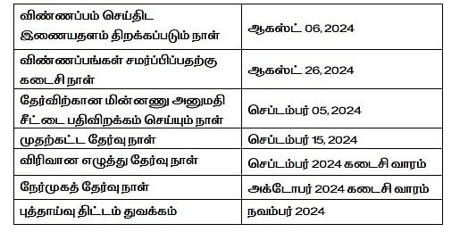 இன்று (06.08.2024) முதல் விண்ணப்பங்கள் பெறப்படும் நிலையில், இணையதள விண்ணப்பங்களை சமர்ப்பிப்பதற்கான கடைசி தேதி 26.08.2024 ஆகும்.