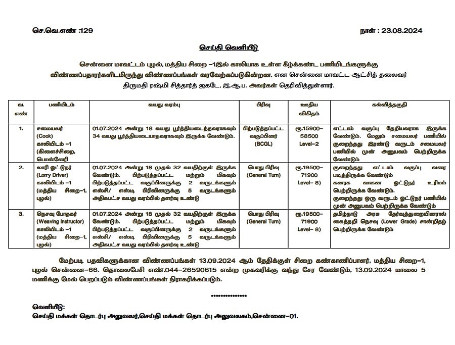 சென்னை மாவட்ட புழல் மத்திய சிறையில் காலியாக உள்ள சமையலர், ஓட்டுநர் பணியிடங்களுக்கான வேலைவாய்ப்பு அறிவிப்பு வெளியிடப்பட்டுள்ளது.