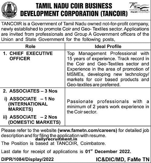 தமிழ்நாடு கயிறு வணிக மேம்பாட்டு நிறுவனத்தில் தலைமை நிர்வாக அதிகாரி பணியிடங்களுக்கான புதிய வேலைவாய்ப்பு அறிவிப்பு வெளியிடப்பட்டுள்ளது.