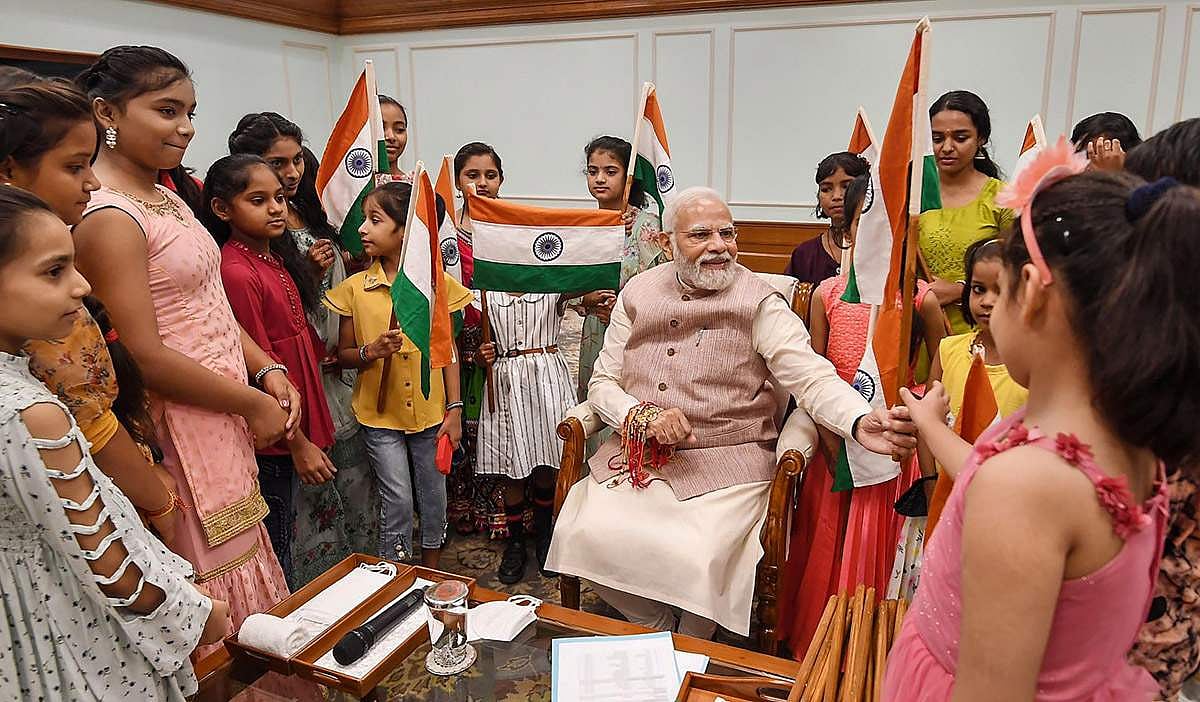 தனது அலுவலக ஊழியர்களின் குழந்தைகளுடன் ரக்ஷா பந்தன் கொண்டாடிய பிரதமர் மோடி.
