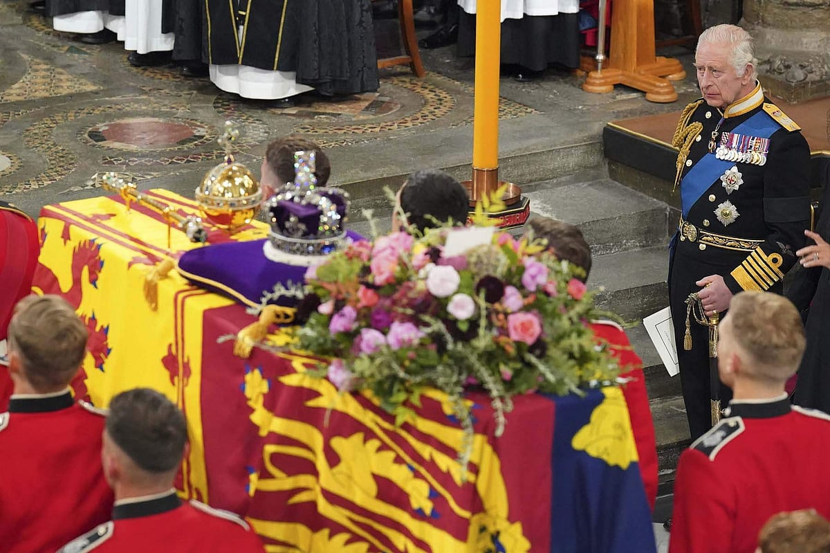 மத்திய லண்டனில் உள்ள வெஸ்ட்மின்ஸ்டர் அபே-வில் ராணி இரண்டாம் எலிசபெத் இறுதிச் சடங்கில் கலந்து கொண்ட மன்னர் மூன்றாம் சார்லஸ்.