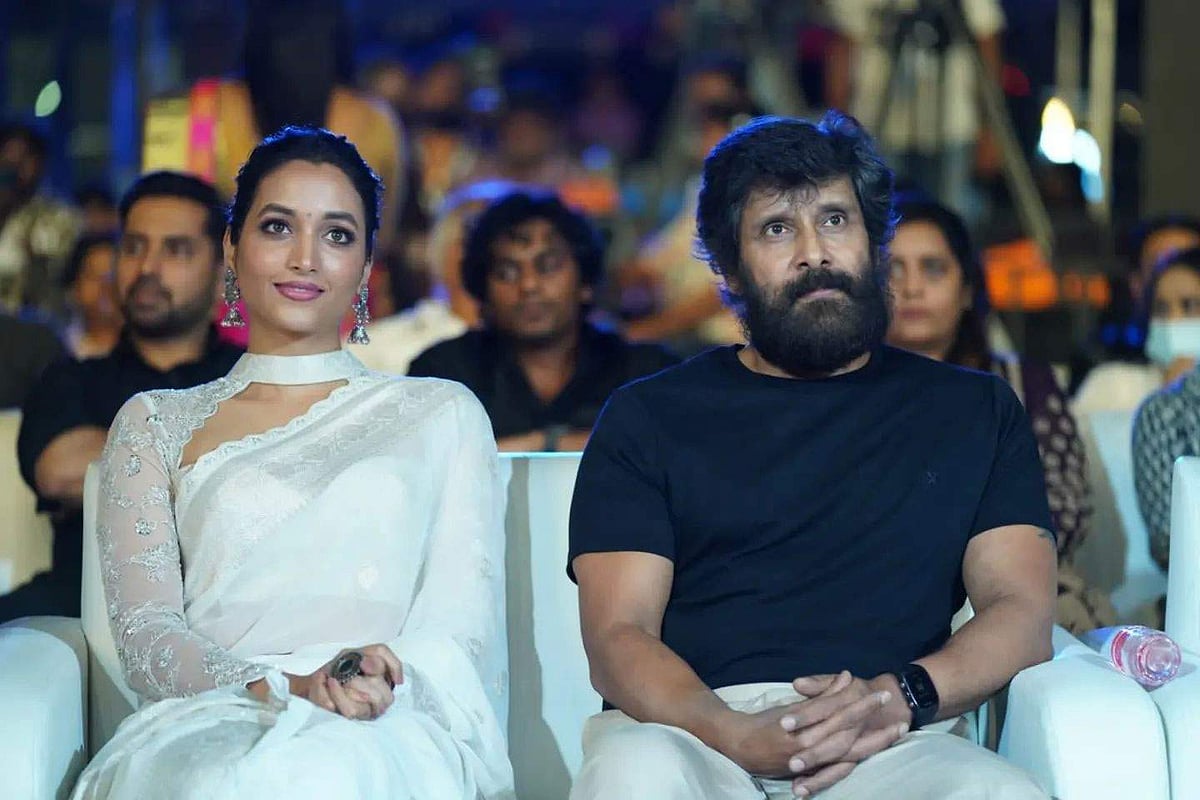 கோப்ரா இசை வெளியீட்டு விழா சென்னை வேளச்சேரியில் உள்ள பீனிக்ஸ் மாலில் கோலகலமாக நடைபெற்றது. இதில் நடிகர் விக்ரம் அருகில் அமர்ந்துள்ள நயாகி ஸ்ரீநிதி ஷெட்டி.