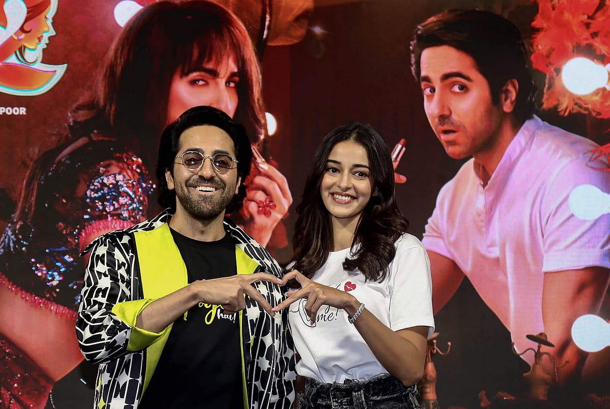 தங்களின் வரவிருக்கும் 'ட்ரீம் கேர்ள் 2' திரைப்படத்தின் டிரெய்லர் வெளியீட்டு விழாவில் கலந்து கொண்ட நடிகர்களான ஆயுஷ்மான் குரானா மற்றும் அனன்யா பாண்டே.
