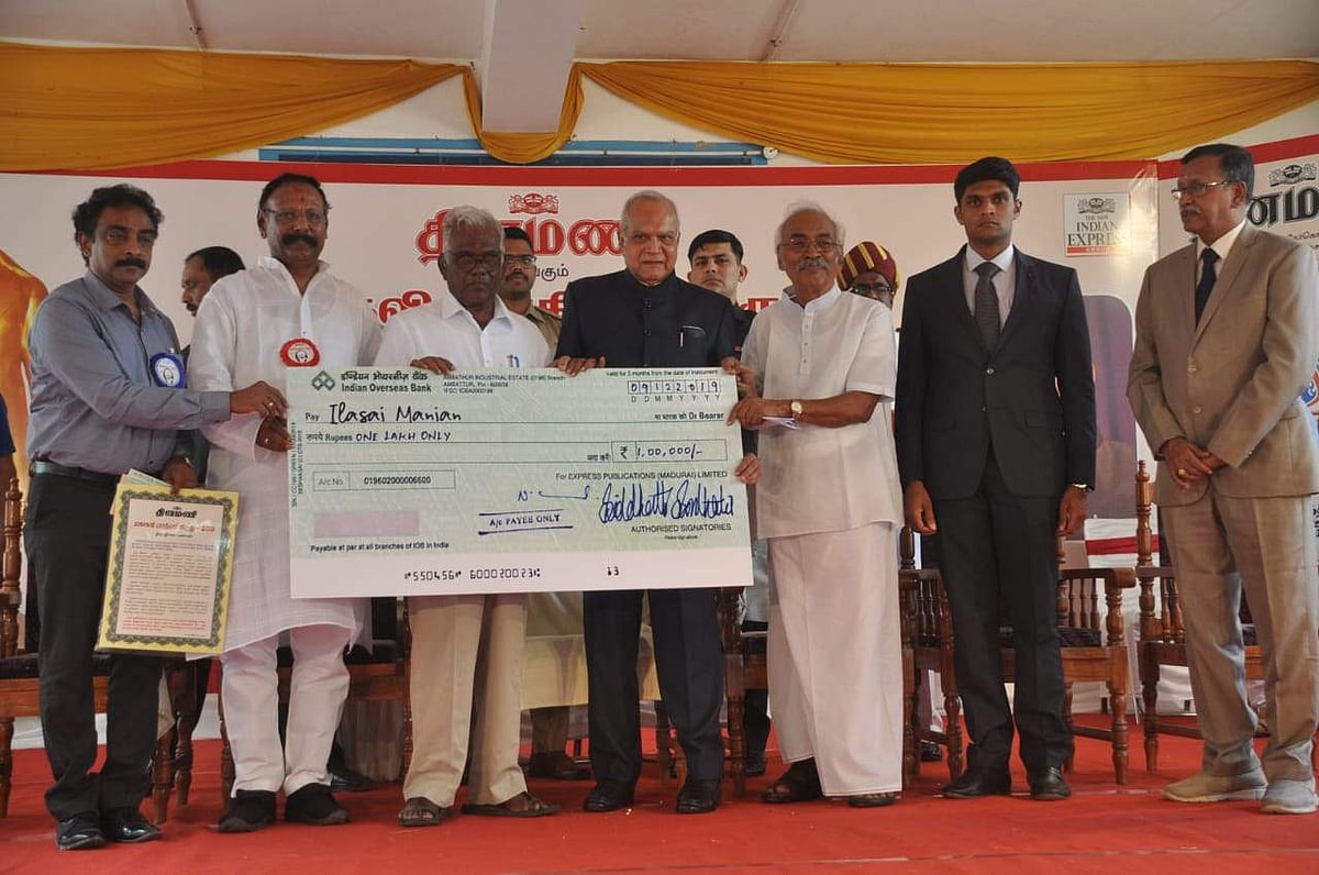 மகாகவி பாரதியாரின் 138-ஆவது பிறந்த நாளையொட்டி, தினமணி சார்பில் மகாகவி பாரதியார் விருது வழங்கும் விழா எட்டயபுரத்தில் இன்று நடைபெற்றது. இதில், தமிழக ஆளுநா் பன்வாரிலால் புரோஹித் கலந்துகொண்டு மூத்த ஆய்வாளா் இளசை மணியனுக்கு விருதை வழங்கினார்.