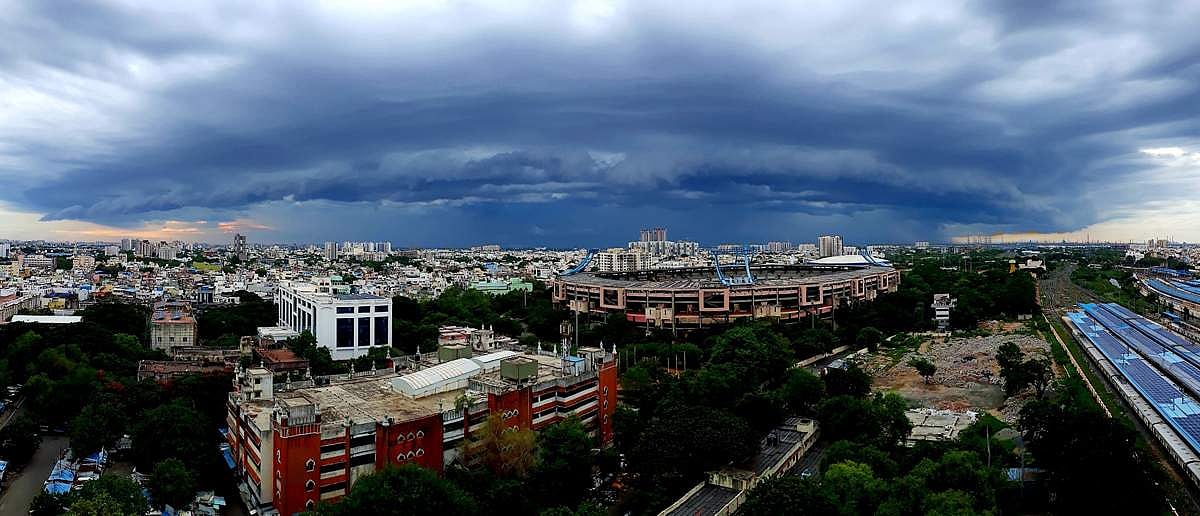 சென்னையில் திடீரென கருமேகங்கள் திரண்டு ரம்யமாக காட்சி அளித்த நேரு உள் விளையாட்டு அரங்கம்.
