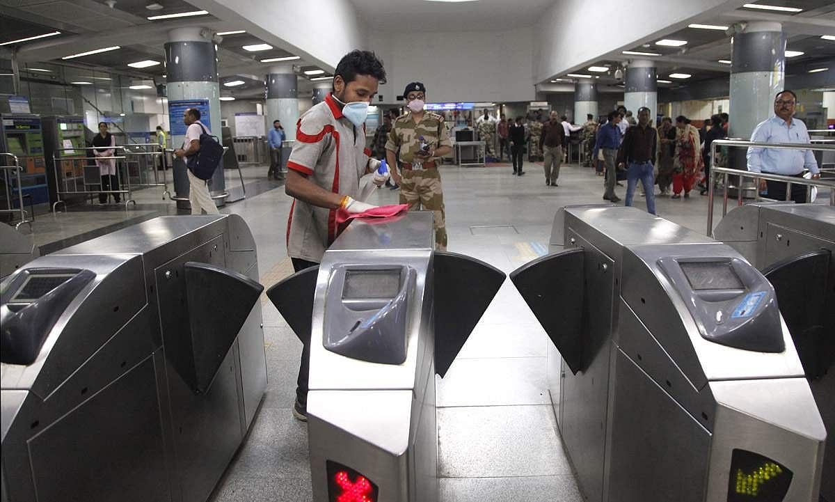 கரோனா வைரஸ் பற்றிய அச்சம் நிலவுகின்ற தற்போதைய சூழ்நிலையில், மெட்ரோவில் பயணம் மேற்கொள்ளும் பயணிகள் முன்னெச்சரிக்கை நடவடிக்கையாக முகமூடி அணிந்து கொண்டு பயணம் செய்யும் தில்லி வாசிகள்.