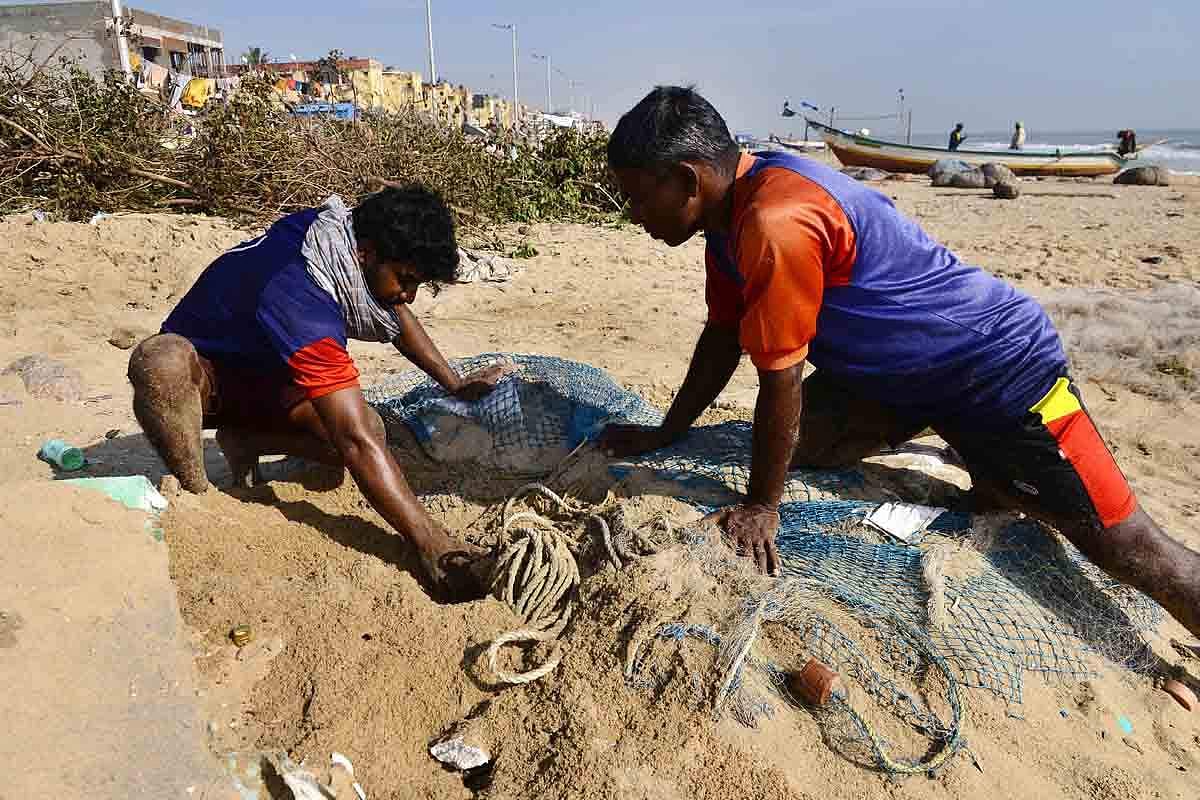 சென்னை ஃபோர்ஷோர் எஸ்டேட் கடற்கரையில் மண்ணில் புதையுண்ட வலையை தேடிப் பிடித்து வெளியில் எடுக்கும் மீனவர்கள்.