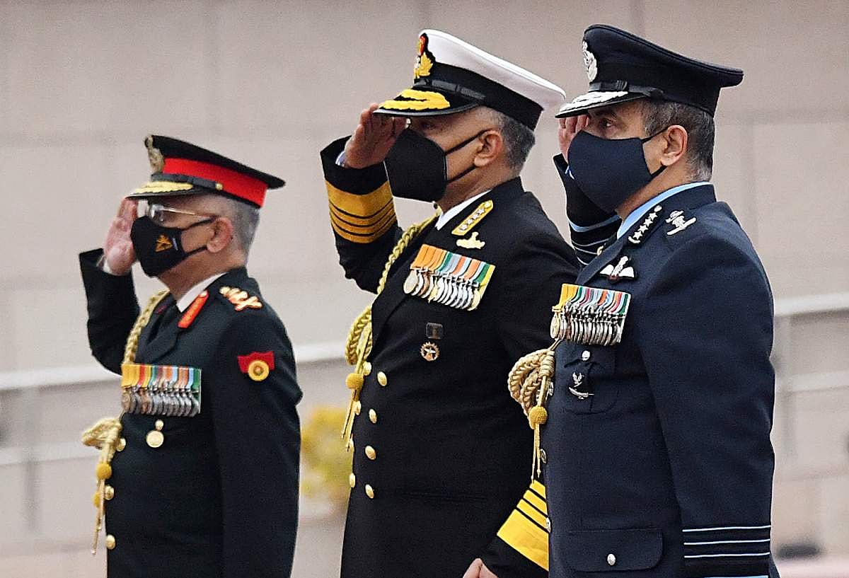 74வது ராணுவ தினத்தை முன்னிட்டு தேசிய போர் நினைவிடத்தில் அஞ்சலி செலுத்திய ராணுவ தலைமை தளபதி மனோஜ் முகுந்த் நரவனே, விமானப்படை தளபதி விஆர் சவுதாரி மற்றும் கடற்படை தளபதி ஆர் ஹரி குமார்.