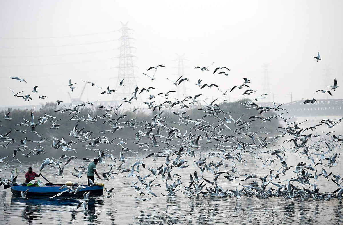 புதுதில்லியில் அதிகாலை வேளையில் யமுனை ஆற்றின் மீது பறந்து கொண்டிருக்கும் சீகல் பறவைகளின் கூட்டத்திற்கு உணவளிக்கும் படகில் இருக்கும் ஒருவர்.