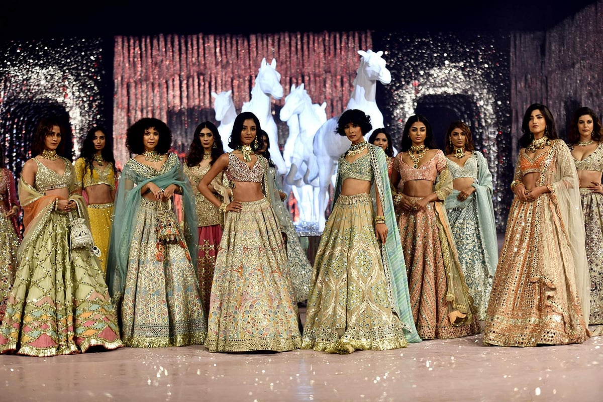 புது தில்லியில் நடைபெற்ற ரன்வே ஷோ 2023ல் டிசைனர் அபினவ் மிஸ்ராவின் கலெக்ஷனை காட்சிப்படுத்திய மாடல் அழகிகள்.