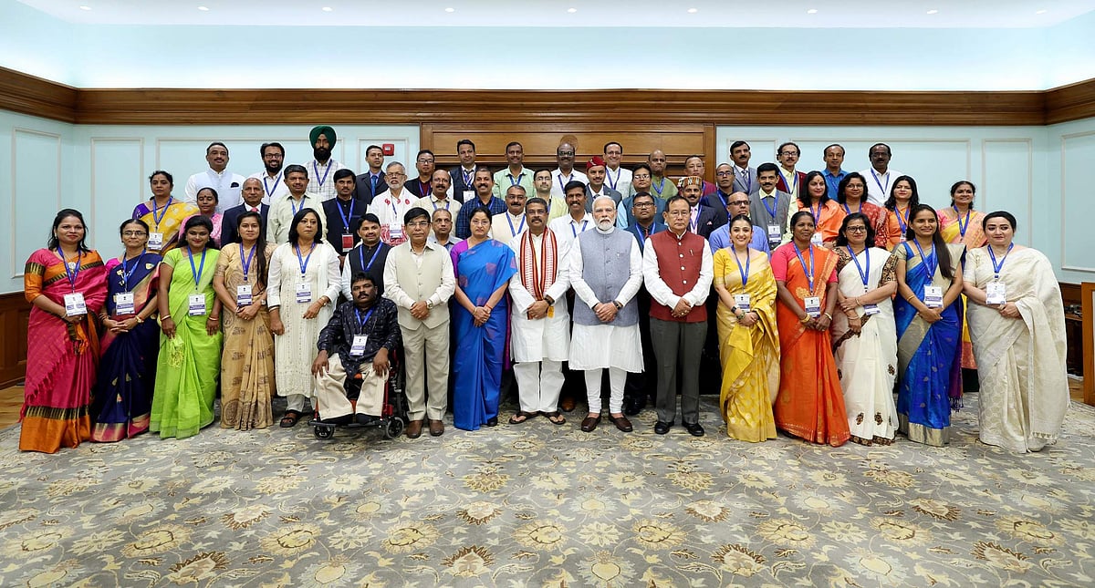 2023-ம் ஆண்டுக்கான தேசிய ஆசிரியர் விருது பெற்றவர்களுடன் குரூப் போட்டோ எடுத்து கொண்ட பிரதமர் நரேந்திர மோடி.