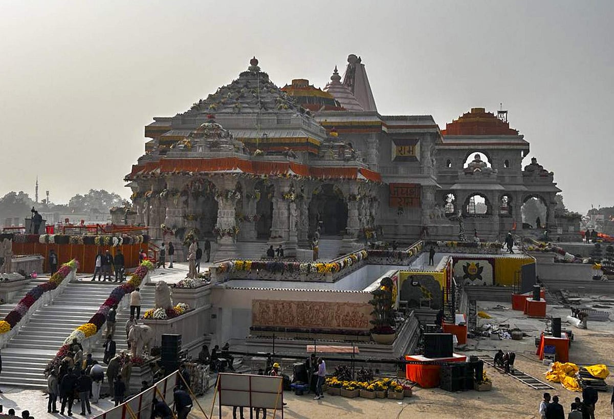 அயோத்தியில் பிரம்மாண்டமாக கட்டப்பட்டுள்ள ராமா் கோயிலில் சிலை பிராணப் பிரதிஷ்டை முன்னிட்டு கோயில் முழுவதும் மலா்கள் மற்றும் சிறப்பு விளக்குகளால் அலங்கரிக்கும் பணி முழுவீச்சில் நடைபெற்று வருகிறது.