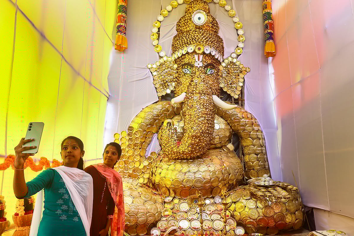 விநாயகர் சதுர்த்தி விழாவையொட்டி சென்னையில் 1500 தம்புலா தட்டுகள், 2500 பித்தளை விளக்குகளால் உருவாக்கப்பட்ட விநாயகர் சிலையை முன் செல்ஃபி எடுத்து மகிழ்ந்த பெண்கள்.