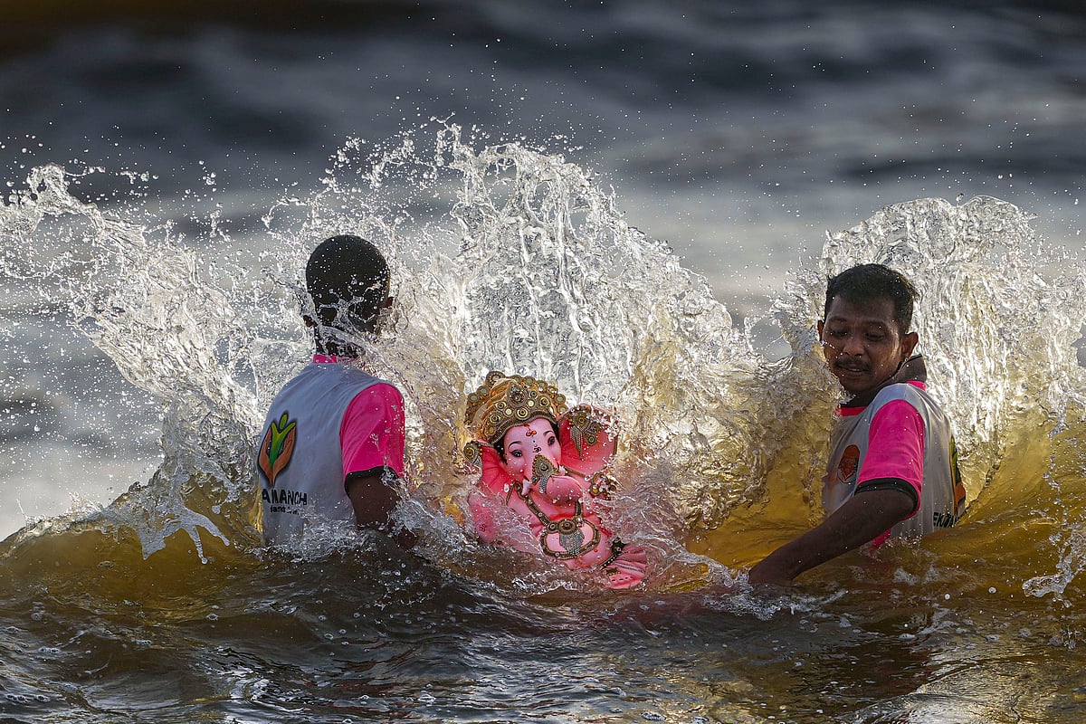 மும்பையில் விநாயகர் சிலைகளை ஊர்வலமாக எடுத்துச் சென்று கடற்கரையில் கரைத்த பக்தர்கள்.