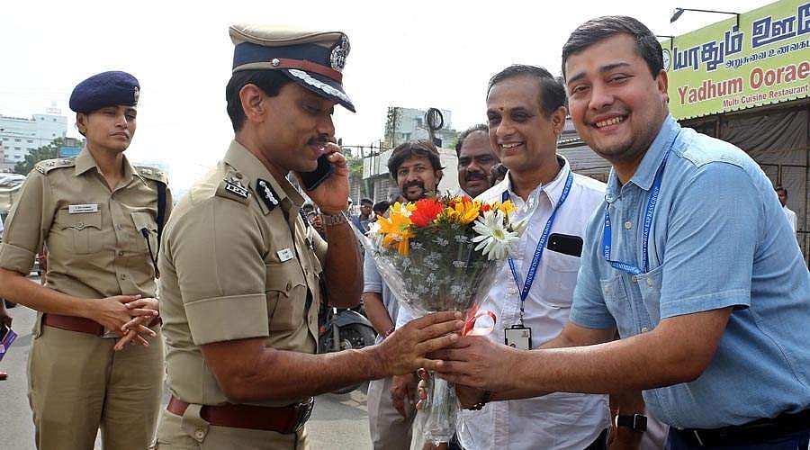 தி நியூ இந்தியன் எக்ஸ்பிரஸ் குழுமம் சார்பில் சென்னையில் நடைபெற்ற தலைக்கவசம் குறித்த விழிப்புணர்வு நிகழ்ச்சியில் தலைக்கவசம் அணியாத வாகன ஓட்டிகளுக்கு இலவசமாக தலைக்கவசம் வழங்கிய தி நியூ இந்தியன் எக்ஸ்பிரஸ் குழுமத்தின் பொது மேலாளர் சித்தார்த் சொந்தாலியா, அருகில் எக்ஸ்பிரஸ் நெட்வொர்க் குழுமத்தின் பொது மேலாளர் ஆர். வெங்கடசுப்பிரமணியன், சென்னை பெருநகர போக்குவரத்து பிரிவு கூடுதல் ஆணையர் ஏ.அருண் மற்றும் துணை ஆணையர் தீபா கனிகர்.