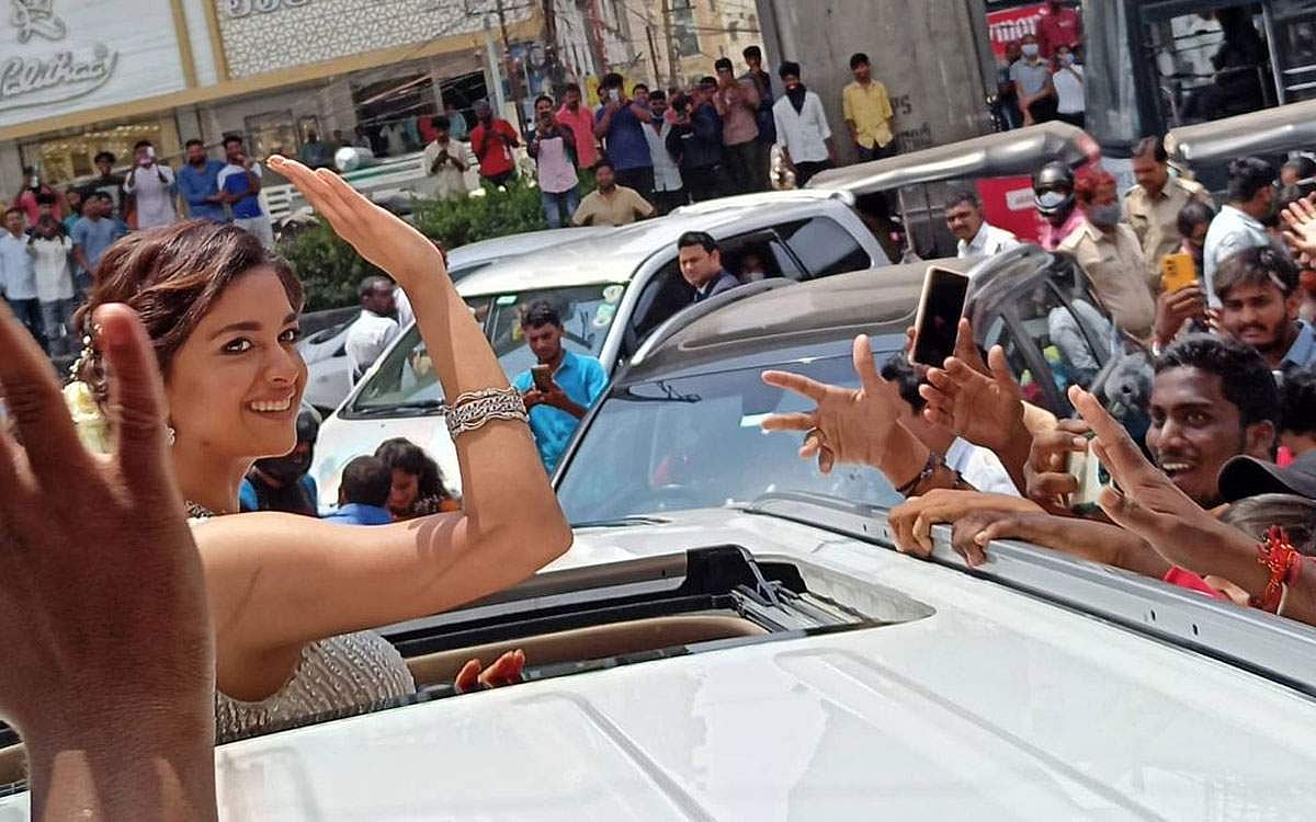 கார் கூரையைத் திறந்து தனது கையை அசைத்து காட்டிய கீர்த்தி சுரேஷ். படம் - ட்விட்டர்
