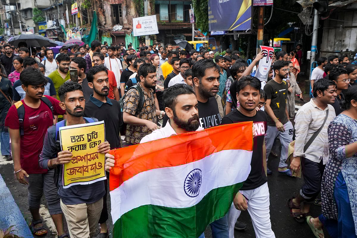 கொல்கத்தாவில் முதுகலை பயிற்சி மருத்துவர் பாலியல் வன்கொடுமை செய்யப்பட்டு கொலை செய்யப்பட்டதை எதிர்த்து பேரணியில் பங்கேற்ற மருத்துவர்கள்.