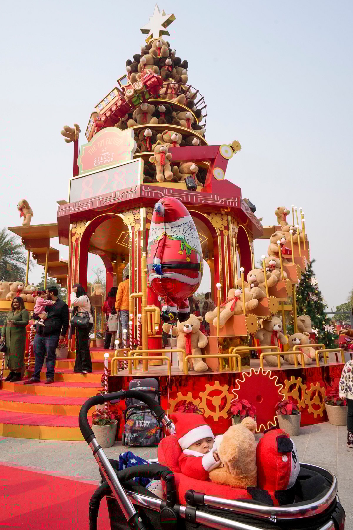 புது தில்லி நெக்ஸஸ் செலக்ட் சிட்டிவாக்கில், கிறிஸ்துமஸுக்கு முந்தைய கொண்டாட்டங்களின் போது டெடி பியர்களைப் பயன்படுத்தி உருவாக்கப்பட்ட 40 அடி கிறிஸ்துமஸ் மரத்திற்கு அருகில், சாண்டா கிளாஸ் உடையணிந்த ஒரு குழந்தை.