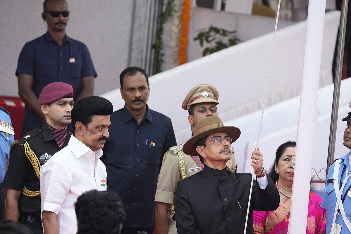 சென்னை, காமராசர் சாலையில் நடைபெற்ற 75வது குடியரசு நாள் விழாவில், தேசிய கொடியினை ஏற்றி வைத்த ஆளுநர் ஆர்.என். ரவி. அருகில் தமிழக முதல்வர் மு.க. ஸ்டாலின் மற்றும் அரசு உயர் அதிகாரிகள்.