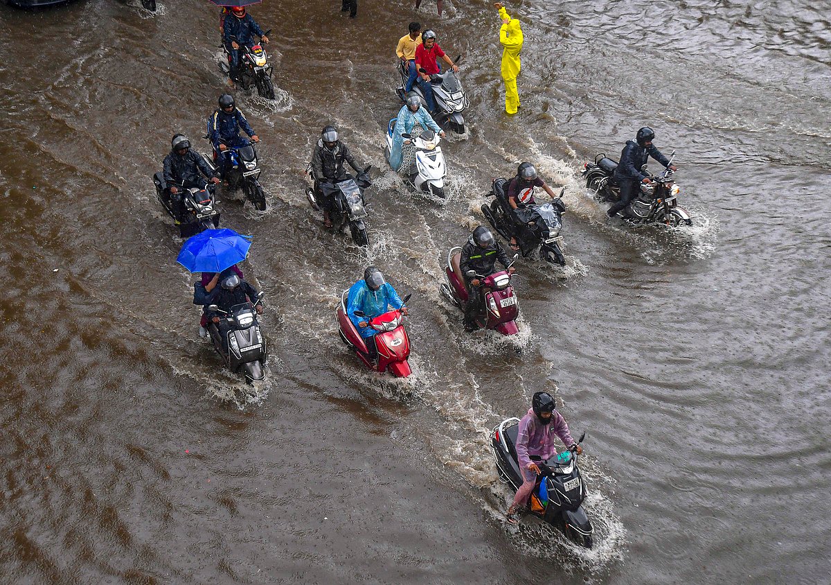 மும்பையில் பெய்த கனமழை தொடர்ந்து தண்ணீர் தேங்கிய சாலையில் ஊர்ந்து செல்லும் இருசக்கர வாகனங்கள்.