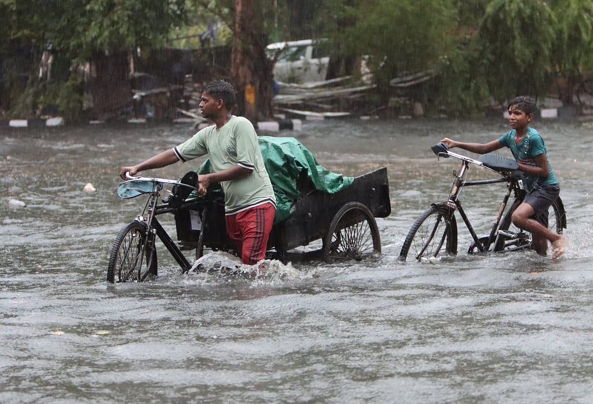 தில்லியில் இரவு முழுவதும் பெய்த கனமழையால் பல பகுதிகள் வெள்ளத்தில் மூழ்கியது. மழைக்கு மத்தியில் தண்ணீர் தேங்கிய சாலையில் சைக்கிளை தள்ளி செல்லும் சிறுவன் ஒருவன்.