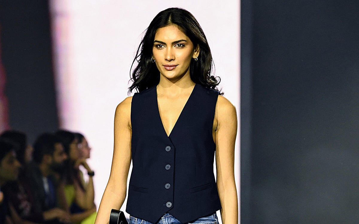 புதுதில்லியில் லக்மே ஃபேஷன் வீக்கில், மார்க்ஸ் மற்றும் ஸ்பென்சர் பிராண்டின் கலெக்ஷனை அணிந்து கொண்டு ஒய்யாரமாக நடந்து வரும் மாடல் அழகி.