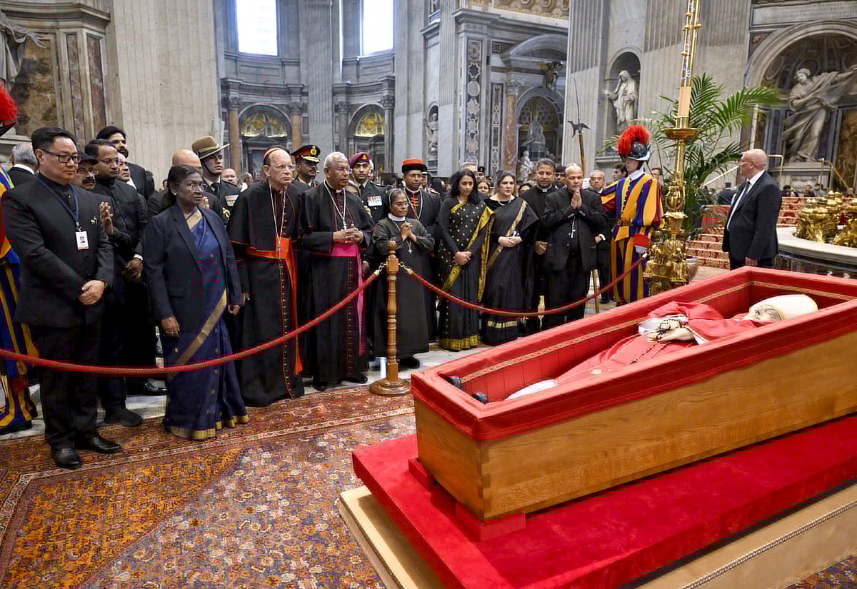 வயது மூப்பு மற்றும் உடல்நலக் குறைவு காரணமாக, அவரது மறைவையொட்டி போப் பிரான்சிஸ் உடல் புனித பீட்டர் பேராலயத்தில் பொதுமக்கள் அஞ்சலிக்காக வைக்கப்பட்டது. உலகம் முழுவதிலுமிருந்து லட்சக்கனக்கான மக்கள் நீண்ட வரிசையில் காத்திருந்து போப் ஆண்டவரின் உடலுக்கு இறுதி மரியாதை செலுத்திய நிலையில், போப் பிரான்சிஸ் உடலுக்கு குடியரசுத் தலைவர் திரௌபதி முர்மு அஞ்சலி செலுத்தினார். அவர்களுடன் அமைச்சர் கிரண் ரிஜிஜு, இணை அமைச்சர் ஜார்ஜ் குரியன் ஆகியோரும் கலந்து கொண்டனர்.