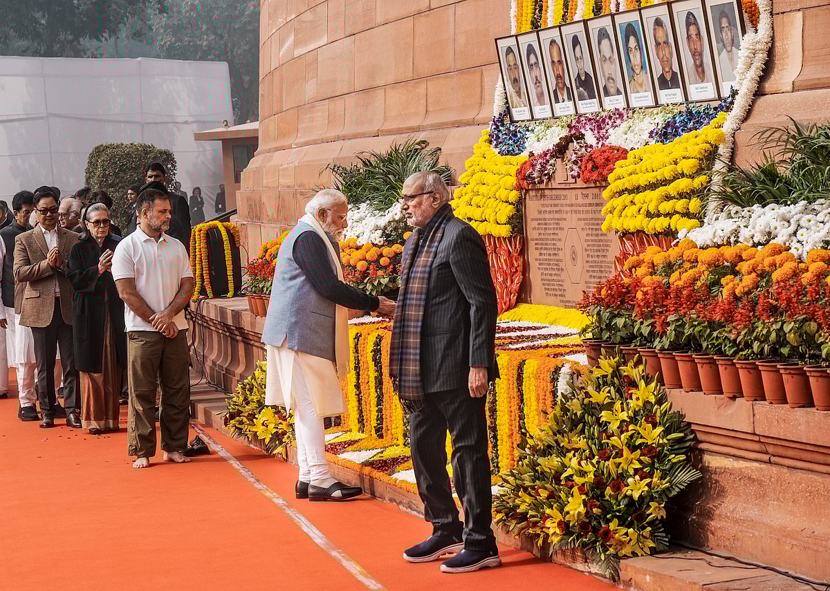 2001-ஆம் ஆண்டு நாடாளுமன்ற தாக்குதல் நினைவு நாளை முன்னிட்டு, வீர மரணம் அடைந்த பாதுகாப்புப் படையினருக்கு நாடாளுமன்ற வளாகத்தில் மலர் தூவி மரியாதை செலுத்திய பிரதமர் மோடி.